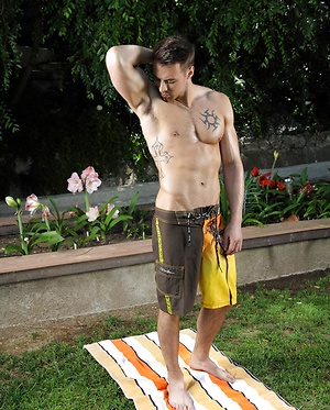 Rich Ryan shows off his tall muscular body, covered in neatly trimmed dark body hair, while jerking his nice big cock.