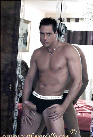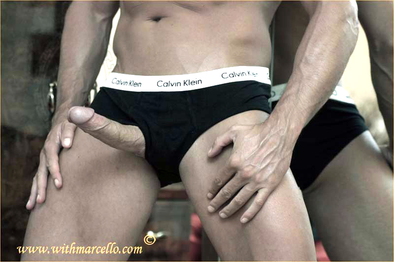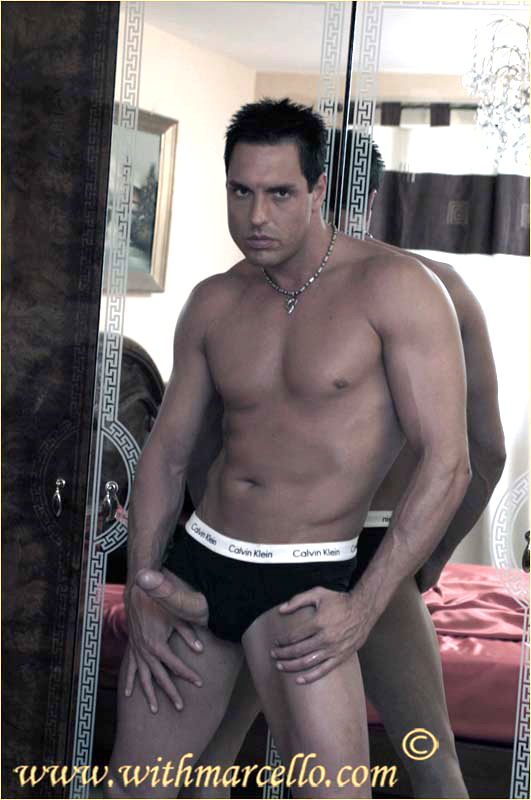 Marcello is wearing Calvin Kleins and masturbating
