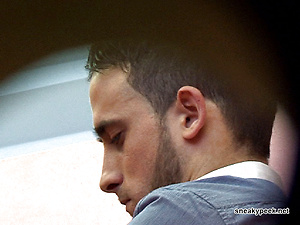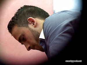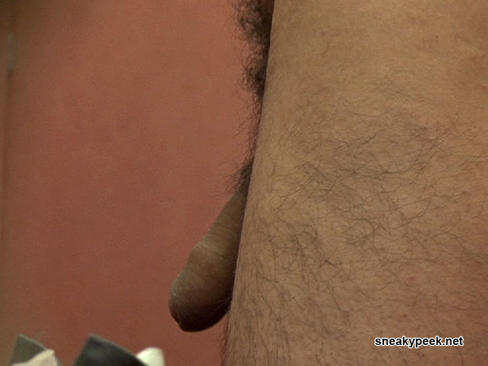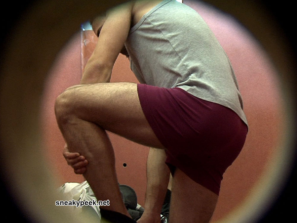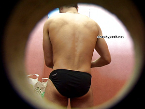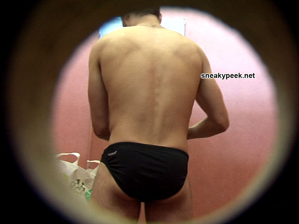 Horny young man entering a swimming pool cubicle to change for a swim.