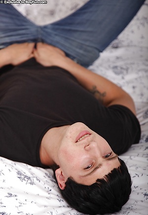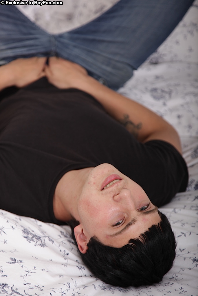 Smooth chested Zac plays with his cock on the futon.