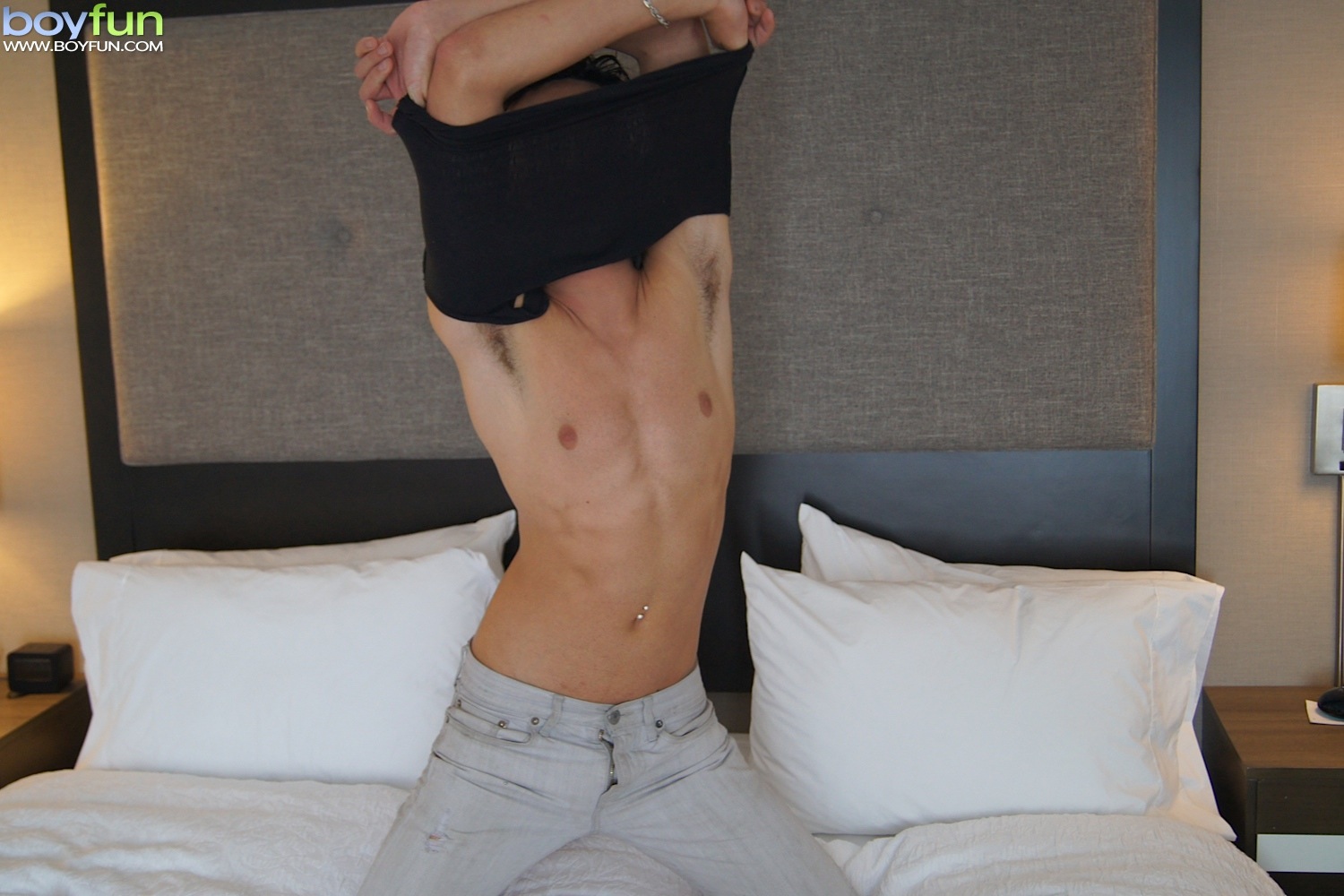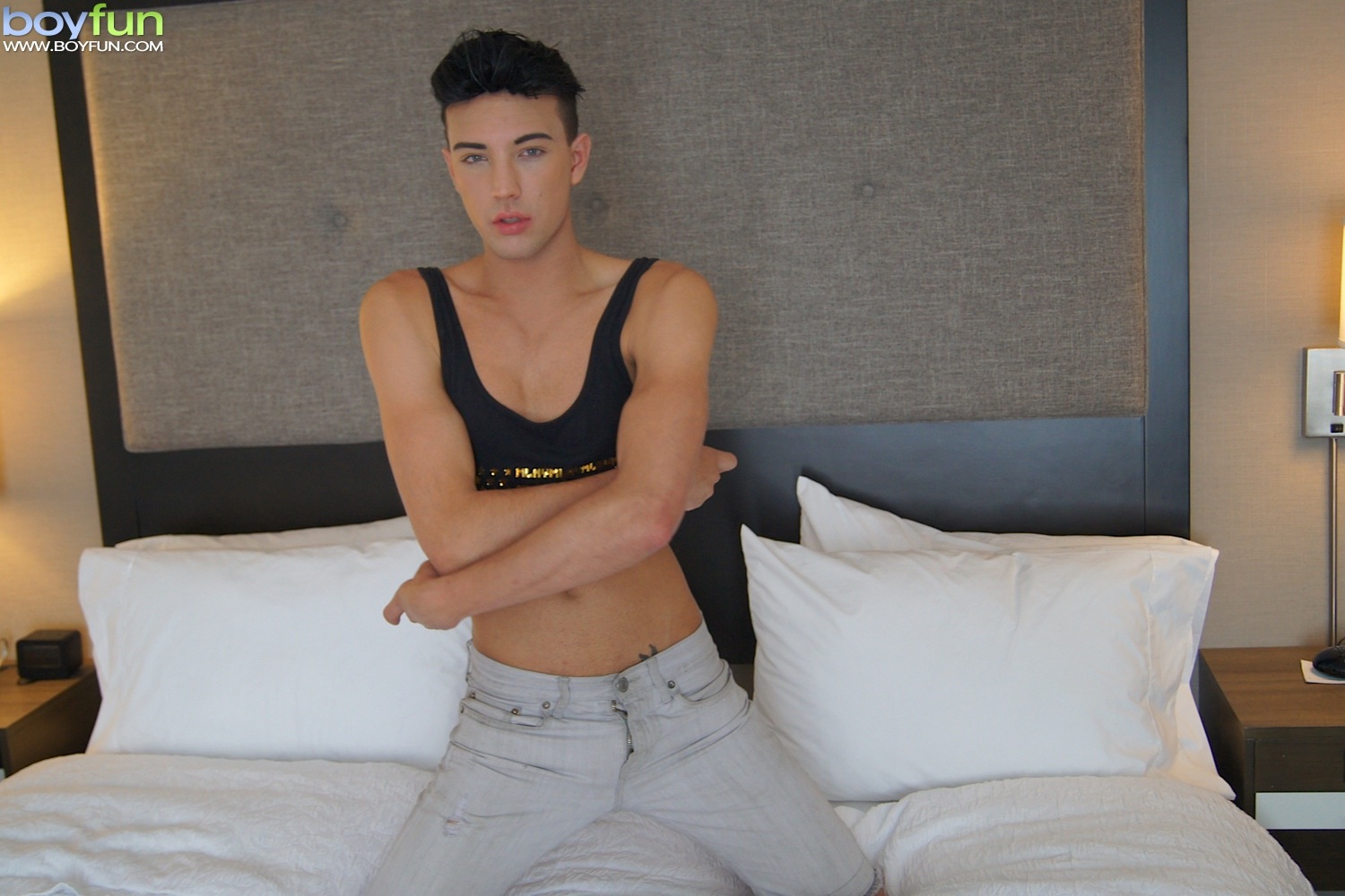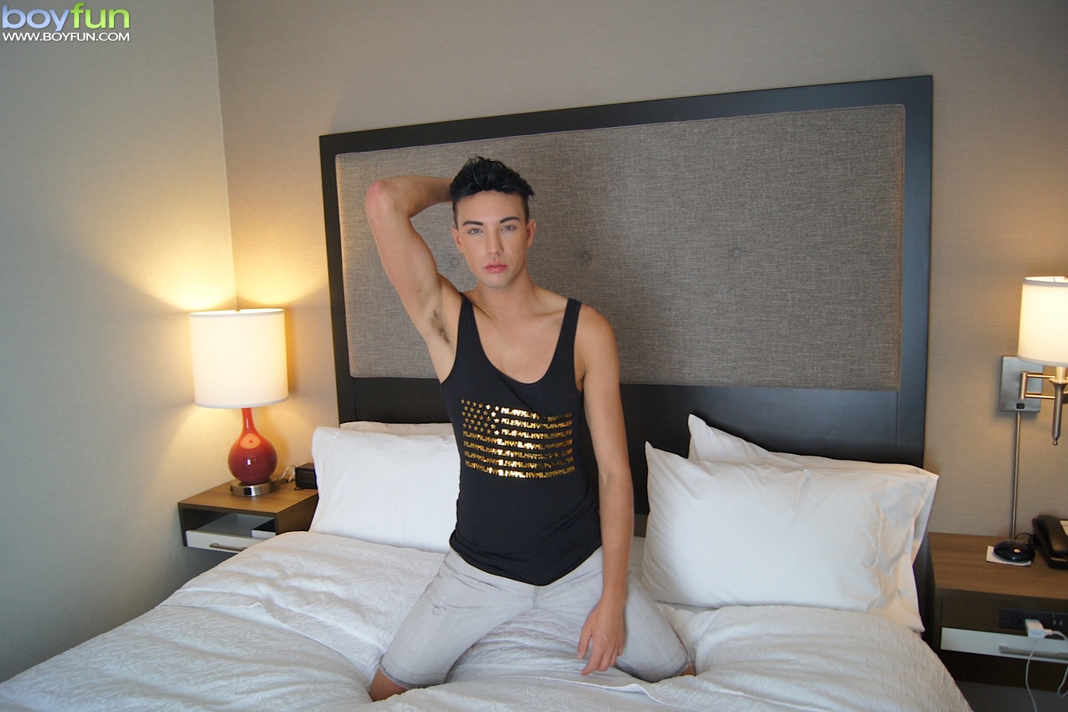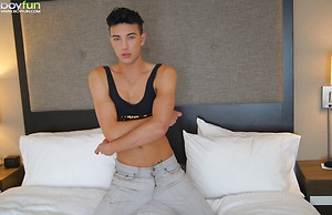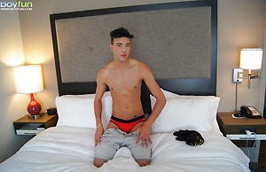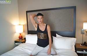 Gorgeous twink Jake Diamante busts a nut onto his abs.